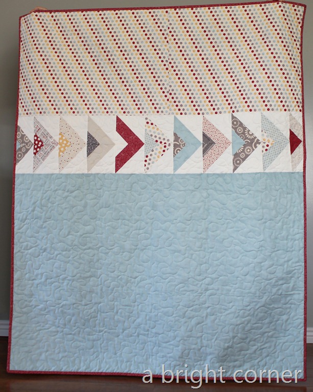 I machine quilted it in just a gentle meandering pattern and then bound it in my favorite red print from this line of fabric. The finished quilt measures 54” x 65” which in my opinion is a great throw-size quilt – big enough to cover you and keep you warm, but not so large that you can lose the remote control in it. You know what I’m talking about, don’t you?